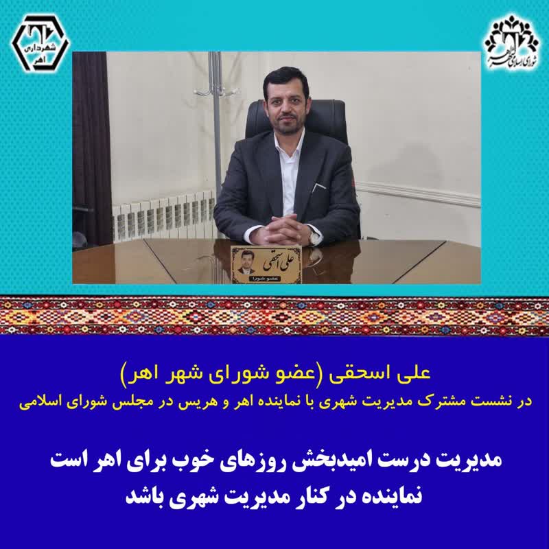 اهر مرکز قره داغ از جمله شهرهای معدود در ایران است که شهرداری در آن قدمت یک صد ساله دارد. من نمیخواهم به ریز درخواستهای شورای اسلامی شهر و شهرداری از نماینده محترم اشاره نمایم، درخواستی که از نماینده محترم داریم، این است که در کنار ما بوده و از طریق مجاری قانونی در سطح کلان و کشوری کمک حال شهرداری باشد. نماینده محترم از اعتبارات و امکانات استانی و کشوری برای شهرداری اهر استفاده نماید.